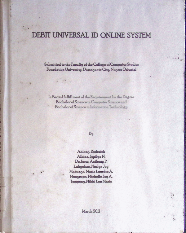 Debit universal ID online system [capstone] / by Roderick Ablong, Jenilyn N. Albina, Anthony P. De Jesus, Norlyn Joy Lubguban, Maria Lourdes A. Mabunga, Michelle Joy A. Mongcupa, and Nikki Lou Marie Tompong.