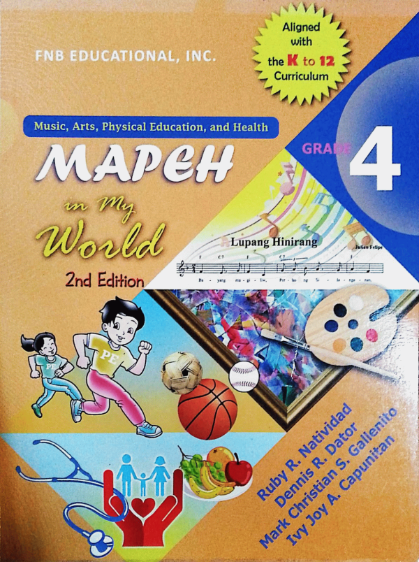 MAPEH in My World 4 (2nd Edition, 2022) by Ruby R. Natividad, Dennis R. Dator, Mark Christian S. Gallenito, and Ivy Joy A. Capunitan is a Grade 4 textbook published by FNB Educational, Inc. It integrates the four key learning areas of the MAPEH curriculum—Music, Arts, Physical Education, and Health—designed to develop students’ creativity, physical fitness, appreciation of the arts, and awareness of personal health and well-being.