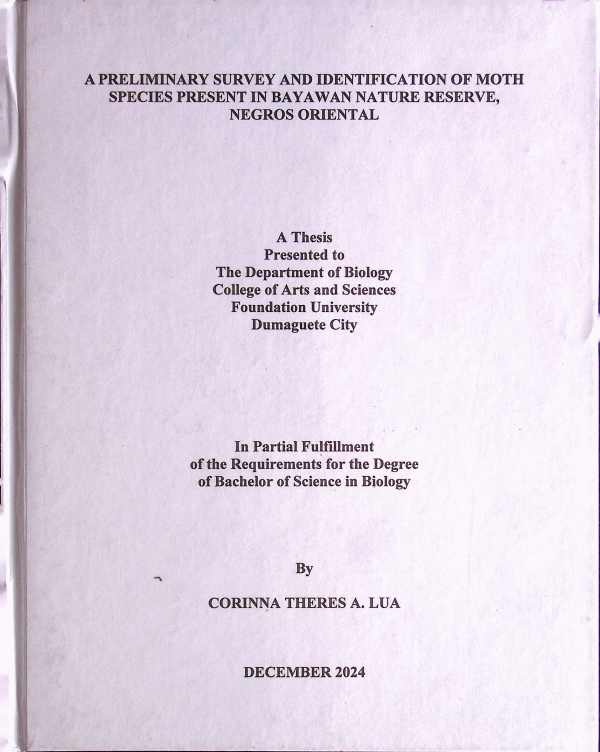 - Biology, Bachelor of Science in. A Preliminary Survey and Identification of Moth Species Present in Bayawan Nature Reserve, Negros Oriental / BIO 117