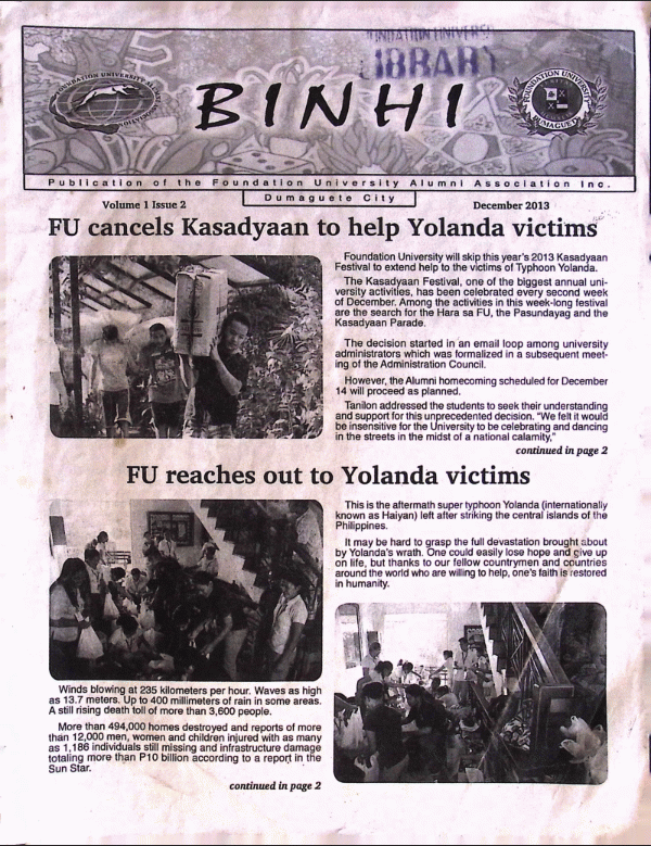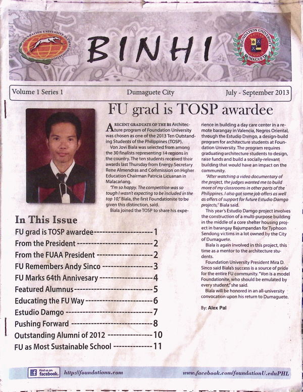 Binhi is a regular publication of Foundation University that highlights important campus news, academic accomplishments, student and faculty initiatives, and community outreach programs. The newsletter serves as a communication platform that informs the university community about ongoing projects, upcoming events, and significant milestones across the institution.