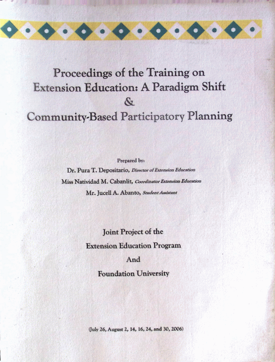 Proceedings of the training on extension education: a paradigm shift & community-based participatory planning by Dr. Pura T. Depositario, Miss Natividat M. Cabanlit and Mr. Jucell A. Abanto
