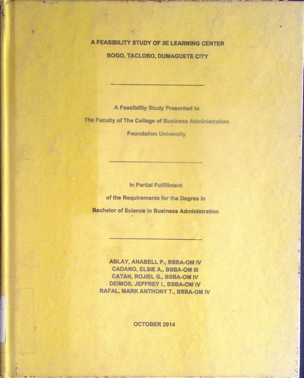 A feasibility study of 3E Learning Center, Bogo, Taclobo, Dumaguete City [undergraduate thesis] / by Anabell P. Ablay, Elsie A. Cadano, Rojiel G. Cata, Jeffrey I. Deimos and Mark Anthony T. Rafal. by