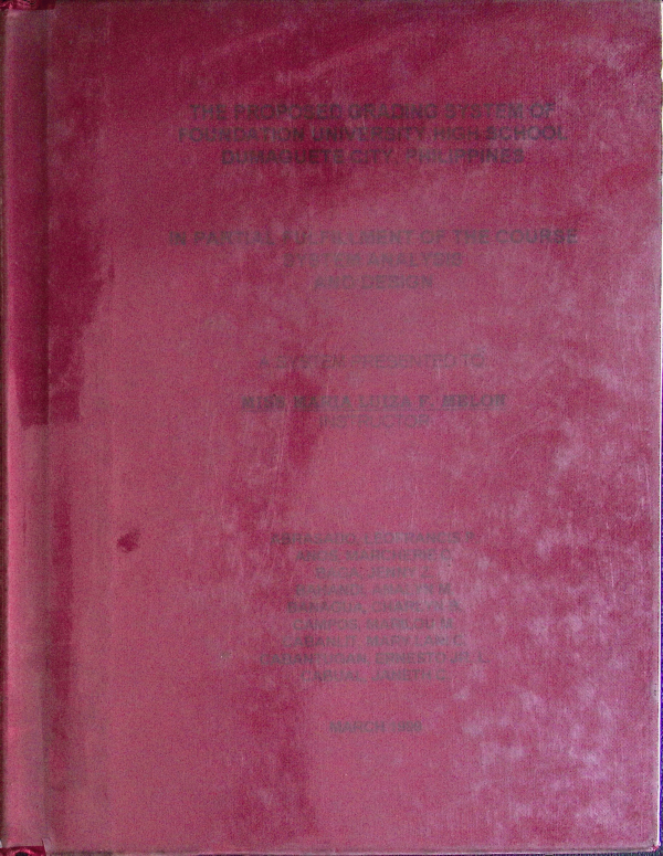 The proposed grading system of Foundation University High School, Dumaguete City, Philippines / by Leofancis P. Abrasado, Marcherie C. Anos, Jenny Z. Baga, Analyn M. Bahandi, Charlyn B. Banagua, Marilou M. Campos, Mary Lani C. Cabanlit, Ernesto L. Cabantugan Jr., and Janeth C. Cabual. by